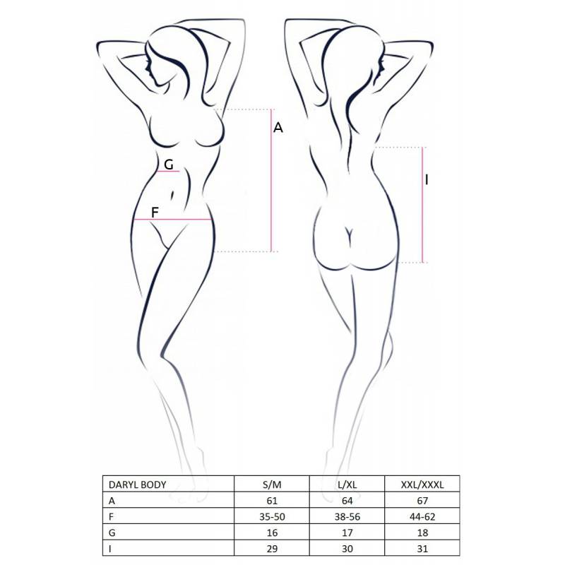 Черное боди Passion Erotic Line DARYL BODY - в нем вы будете выглядеть невероятно соблазнительно и эффектно. Тонкое черное кружево с цветочным рисунком облегает тело, подчеркивая стройность силуэта. Глубокий V-образный разрез и небольшая шнуровка акцентируют внимание на груди и животике, оставляя при этом простор для фантазии. Изюминка этой модели - полностью открытая спина, которая без сомнения не оставит вашего партнера равнодушным.
